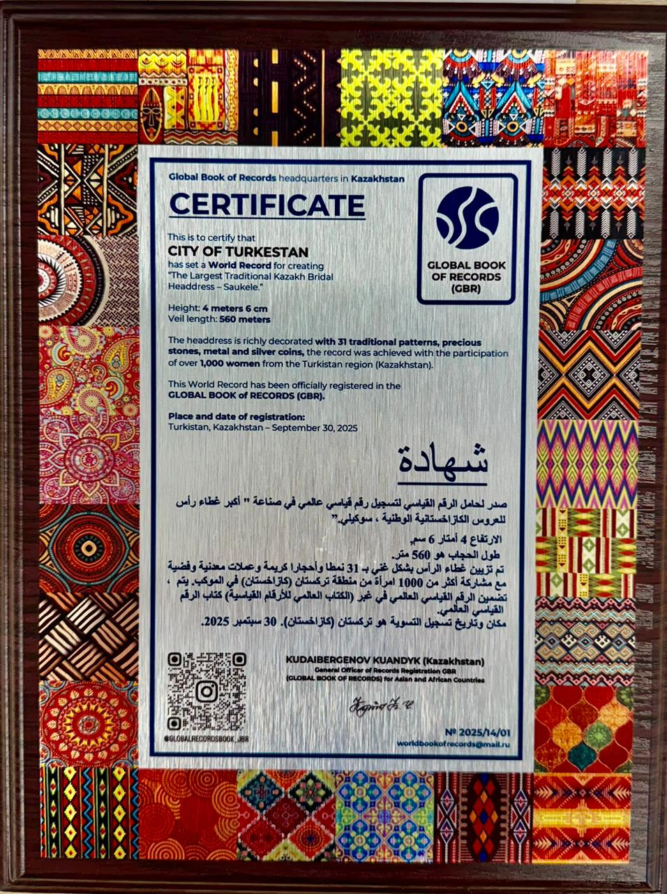 Национальный головной убор для женщин имеет высоту более 5 метров и покрытие 600 метров. Кроме того, саукеле попало в международную Книгу рекордов «Global Book of Records» и получил специальный сертификат.