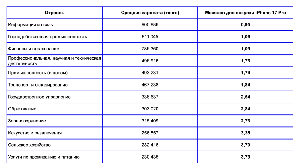Фактически, только работники IT, финансового и сырьевого секторов могут позволить себе iPhone 17 Pro без кредита. Для большинства остальных сфер — это покупка на уровне 2-3 зарплат.