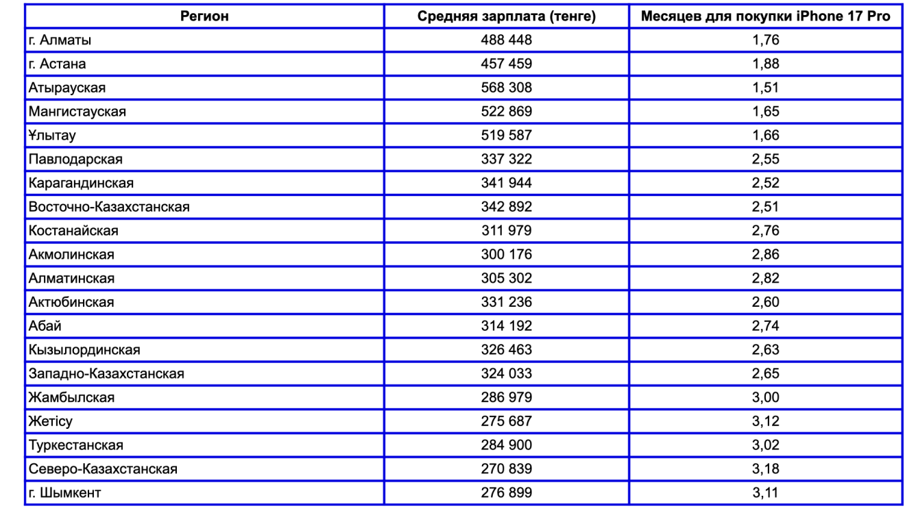 Согласно данным Бюро национальной статистики за 2024 год среднемесячная зарплата по Казахстану составила 384 266 тенге. Это означает, что в среднем казахстанцу нужно отложить всю зарплату за 2,24 месяца, чтобы позволить себе новый iPhone 17 Pro — при условии, что он не делает никаких других расходов.