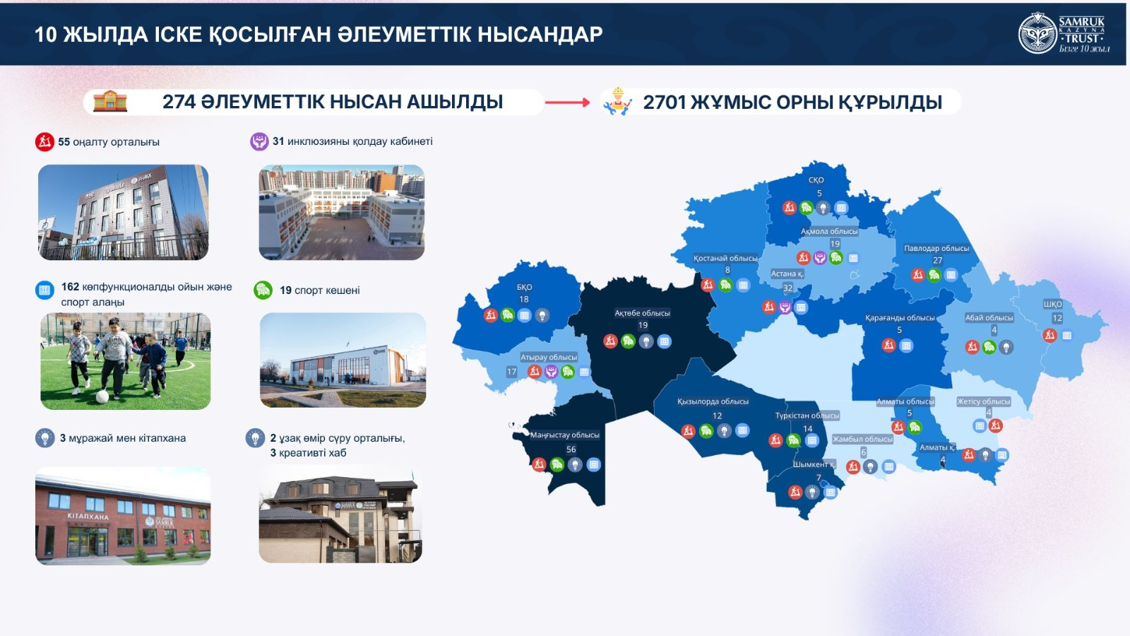За десять лет в Казахстане сформирована сеть социальных объектов: реабилитационные и инклюзивные центры, кабинеты поддержки инклюзии, спортивные комплексы, музеи и библиотеки, центры активного долголетия, креативные хабы, а также более тысячи многофункциональных игровых и спортивных площадок.