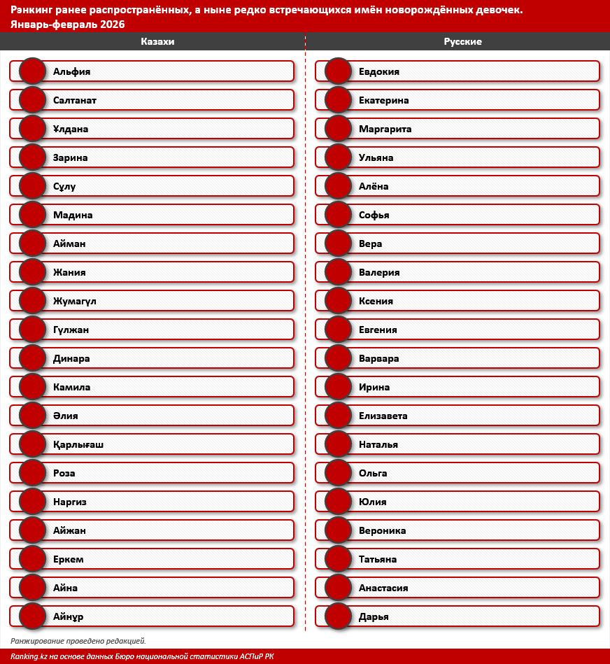 В Казахстане продолжается смена трендов в выборе имён для новорождённых девочек. Имена, которые ещё недавно были широко распространены, сегодня становятся редкостью. Об этом сообщает Qaz365.kz со ссылкой на Ranking.kz.