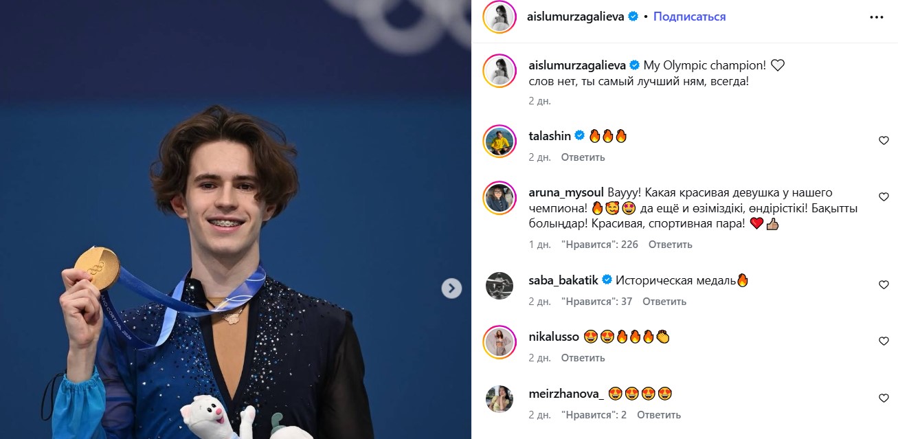 По данным Instagram-страницы taby.nu, возлюбленной фигуриста является Айсулу Мырзагалиева – профессиональная спортсменка, чемпионка Азии по художественной гимнастике и одна из заметных представительниц национальной сборной.