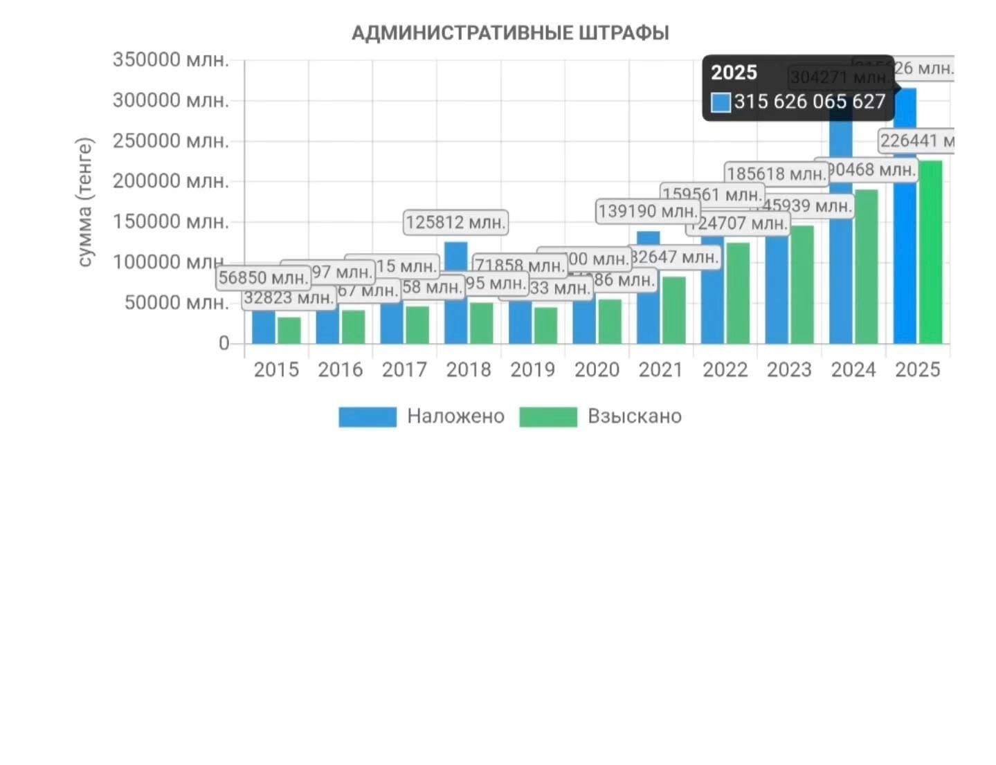 «В прошлом году мы впервые зафиксировали более 300 миллиардов тенге штрафов, но в этом году эта цифра снова выросла и превысила 315 миллиардов. Поздравляю всех с новым рекордом», – заявил общественный деятель.